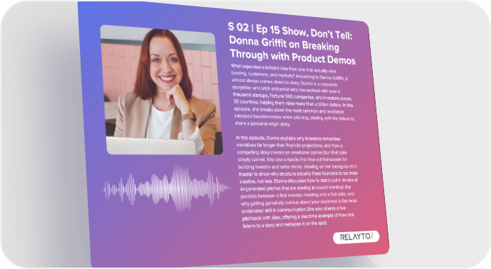S 02 | Ep 15 Show , Don ’ t Tell : Donna Griffit on Breaking Through with Product Demos What separates a brilliant idea from one that actually wins funding , customers , and markets ? According to Donna Griffith , it almost always comes down to story . Donna is a corporate storyteller and pitch alchemist who has worked with over a thousand startups , Fortune 500 companies , and investors across 30 countries , helping them raise more than a billion dollars . In this episode , she breaks down the most common and avoidable mistakes founders make when pitching , starting with the failure to share a personal origin story . In this episode , Donna explains why investors remember narratives far longer than financial projections , and how a compelling story creates an emotional connection that data simply cannot . She also unpacks her four - act framework for building investor and sales decks , drawing on her background in theater to show why structure actually frees founders to be more creative , not less . Donna discusses how to stand out in an era of AI - generated pitches that are starting to sound identical , the parallels between a first investor meeting and a first date , and why getting genuinely curious about your audience is the most underrated skill in communication . She also shares a live pitchback with Alex , offering a real - time example of how she listens to a story and reshapes it on the spot .