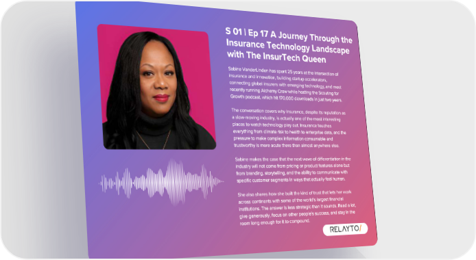 S 01 | Ep 17 A Journey Through the Insurance Technology Landscape with The InsurTech Queen Sabine VanderLinden has spent 25 years at the intersection of insurance and innovation , building startup accelerators , connecting global insurers with emerging technology , and most recently running Alchemy Crew while hosting the Scouting for Growth podcast , which hit 170 , 000 downloads in just two years . The conversation covers why insurance , despite its reputation as a slow - moving industry , is actually one of the most interesting places to watch technology play out . Insurance touches everything from climate risk to health to enterprise data , and the pressure to make complex information consumable and trustworthy is more acute there than almost anywhere else . Sabine makes the case that the next wave of differentiation in the industry will not come from pricing or product features alone but from branding , storytelling , and the ability to communicate with specific customer segments in ways that actually feel human . She also shares how she built the kind of trust that lets her work across continents with some of the world ' s largest financial institutions . The answer is less strategic than it sounds . Read a lot , give generously , focus on other people ' s success , and stay in the room long enough for it to compound .