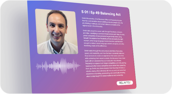 S 01 | Ep 49 Balancing Act Dmitri Shevelenko , Chief Business Officer at Perplexity AI , joins Alex for a conversation about building products people love , the art of timing in startups , and what it takes to compete at the highest level in the AI industry . Dmitri talks about his career path through Facebook , LinkedIn , and Uber , identifying a common thread across each stop , he only joined companies whose products he genuinely loved using himself . He explains how Perplexity arrived at exactly the right moment , when large language models became sophisticated enough to deliver natural language answers at speed , and why that timing made all the difference . Dmitri walks through the core product priorities of accuracy , speed , and readability , and how the team constantly balances those tensions to create an experience that saves users time while activating their natural curiosity . He discusses how a lean team with an obsessive focus on execution has allowed Perplexity to outpace much larger competitors , and why adding headcount often slows companies down rather than speeding them up . Dmitri also shares lessons from founding Tortoise , a robotics startup that ultimately did not succeed , and what that experience of pivoting , persevering , and eventually knowing when to stop taught him about resilience and ownership .