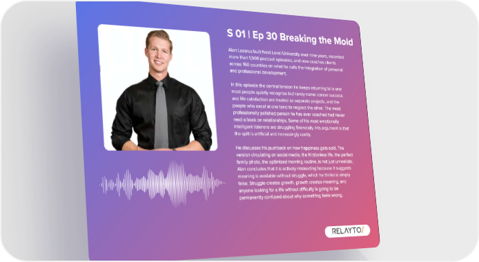 S 01 | Ep 30 Breaking the Mold Alan Lazarus built Next Level University over nine years , recorded more than 1 , 500 podcast episodes , and now coaches clients across 160 countries on what he calls the integration of personal and professional development . In this episode the central tension he keeps returning to is one most people quietly recognize but rarely name : career success and life satisfaction are treated as separate projects , and the people who excel at one tend to neglect the other . The most professionally polished person he has ever coached had never read a book on relationships . Some of his most emotionally intelligent listeners are struggling financially . His argument is that the split is artificial and increasingly costly . He discusses his pushback on how happiness gets sold . The version circulating on social media , the frictionless life , the perfect family photo , the optimized morning routine , is not just unrealistic . Alan concludes that it is actively misleading because it suggests meaning is available without struggle , which he thinks is simply false . Struggle creates growth , growth creates meaning , and anyone looking for a life without difficulty is going to be permanently confused about why something feels wrong .