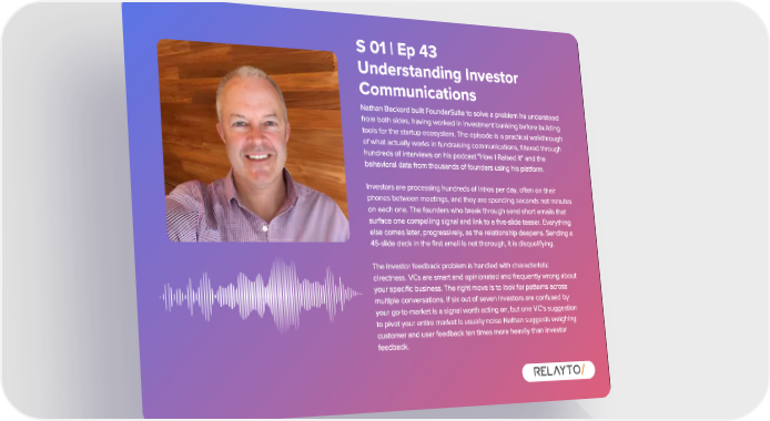 S 01 | Ep 43 Understanding Investor Communications Nathan Beckord built FounderSuite to solve a problem he understood from both sides , having worked in investment banking before building tools for the startup ecosystem . The episode is a practical walkthrough of what actually works in fundraising communications , filtered through hundreds of interviews on his podcast " How I Raised It " and the behavioral data from thousands of founders using his platform . Investors are processing hundreds of intros per day , often on their phones between meetings , and they are spending seconds not minutes on each one . The founders who break through send short emails that surface one compelling signal and link to a five - slide teaser . Everything else comes later , progressively , as the relationship deepens . Sending a 45 - slide deck in the first email is not thorough , it is disqualifying . The investor feedback problem is handled with characteristic directness . VCs are smart and opinionated and frequently wrong about your specific business . The right move is to look for patterns across multiple conversations . If six out of seven investors are confused by your go - to - market is a signal worth acting on , but one VC ' s suggestion to pivot your entire market is usually noise Nathan suggests weighing customer and user feedback ten times more heavily than investor feedback .