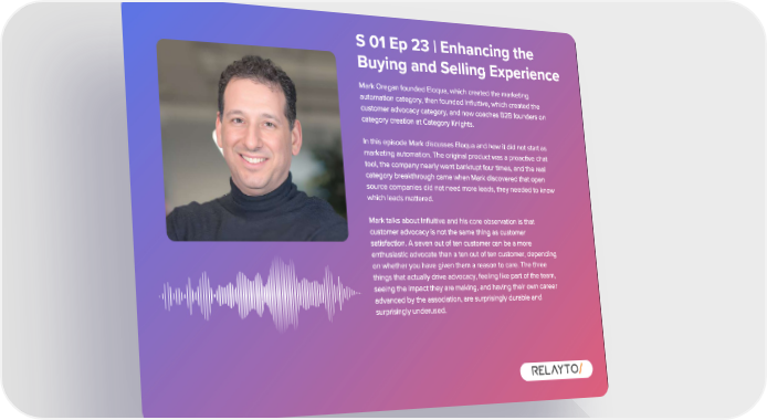 S 01 Ep 23 | Enhancing the Buying and Selling Experience Mark Oregan founded Eloqua , which created the marketing automation category , then founded Influitive , which created the customer advocacy category , and now coaches B2B founders on category creation at Category Knights . In this episode Mark discusses Eloqua and how it did not start as marketing automation . The original product was a proactive chat tool , the company nearly went bankrupt four times , and the real category breakthrough came when Mark discovered that open source companies did not need more leads , they needed to know which leads mattered . Mark talks about Influitive and his core observation is that customer advocacy is not the same thing as customer satisfaction . A seven out of ten customer can be a more enthusiastic advocate than a ten out of ten customer , depending on whether you have given them a reason to care . The three things that actually drive advocacy , feeling like part of the team , seeing the impact they are making , and having their own career advanced by the association , are surprisingly durable and surprisingly underused .