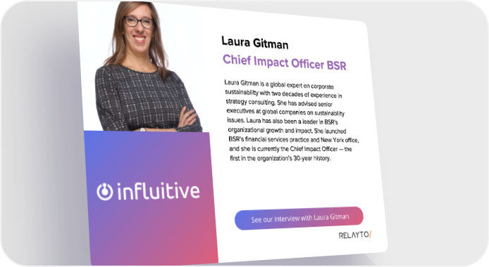 See our interview with Laura Gitman Laura Gitman Laura Gitman is a global expert on corporate sustainability with two decades of experience in strategy consulting . She has advised senior executives at global companies on sustainability issues . Laura has also been a leader in BSR ’ s organizational growth and impact . She launched BSR ’ s financial services practice and New York office , and she is currently the Chief Impact Officer — the first in the organization ’ s 30 - year history . Chief Impact Officer BSR