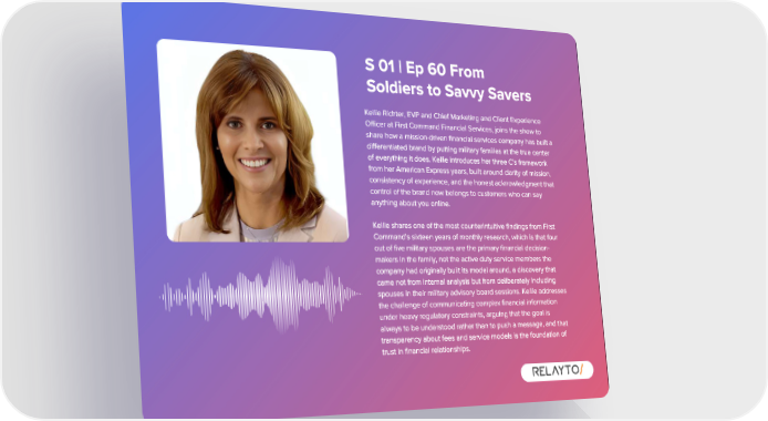 S 01 | Ep 60 From Soldiers to Savvy Savers Kellie Richter , EVP and Chief Marketing and Client Experience Officer at First Command Financial Services , joins the show to share how a mission - driven financial services company has built a differentiated brand by putting military families at the true center of everything it does . Kellie introduces her three C ' s framework from her American Express years , built around clarity of mission , consistency of experience , and the honest acknowledgment that control of the brand now belongs to customers who can say anything about you online . Kellie shares one of the most counterintuitive findings from First Command ' s sixteen years of monthly research , which is that four out of five military spouses are the primary financial decision - makers in the family , not the active duty service members the company had originally built its model around , a discovery that came not from internal analysis but from deliberately including spouses in their military advisory board sessions . Kellie addresses the challenge of communicating complex financial information under heavy regulatory constraints , arguing that the goal is always to be understood rather than to push a message , and that transparency about fees and service models is the foundation of trust in financial relationships .