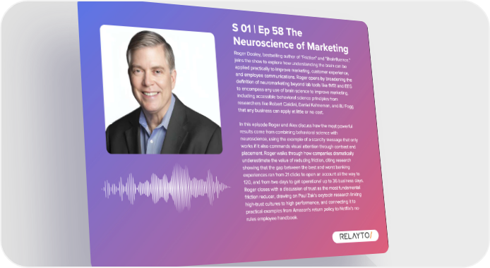 S 01 | Ep 58 The Neuroscience of Marketing Roger Dooley , bestselling author of " Friction " and " Brainfluence ," joins the show to explore how understanding the brain can be applied practically to improve marketing , customer experience , and employee communications . Roger opens by broadening the definition of neuromarketing beyond lab tools like fMRI and EEG to encompass any use of brain science to improve marketing , including accessible behavioral science principles from researchers like Robert Cialdini , Daniel Kahneman , and BJ Fogg that any business can apply at little or no cost . In this episode Roger and Alex discuss how the most powerful results come from combining behavioral science with neuroscience , using the example of a scarcity message that only works if it also commands visual attention through contrast and placement . Roger walks through how companies dramatically underestimate the value of reducing friction , citing research showing that the gap between the best and worst banking experiences ran from 21 clicks to open an account all the way to 120 , and from two days to get operational up to 36 business days . Roger closes with a discussion of trust as the most fundamental friction reducer , drawing on Paul Zak ' s oxytocin research linking high - trust cultures to high performance , and connecting it to practical examples from Amazon ' s return policy to Netflix ' s no - rules employee handbook .