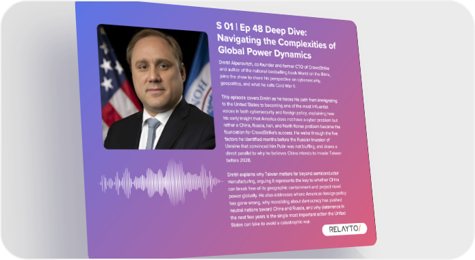 S 01 | Ep 48 Deep Dive : Navigating the Complexities of Global Power Dynamics Dmitri Alperovitch , co - founder and former CTO of CrowdStrike and author of the national bestselling book World on the Brink , joins the show to share his perspective on cybersecurity , geopolitics , and what he calls Cold War II . This episode covers Dmitri as he traces his path from immigrating to the United States to becoming one of the most influential voices in both cybersecurity and foreign policy , explaining how his early insight that America does not have a cyber problem but rather a China , Russia , Iran , and North Korea problem became the foundation for CrowdStrike ' s success . He walks through the five factors he identified months before the Russian invasion of Ukraine that convinced him Putin was not bluffing , and draws a direct parallel to why he believes China intends to invade Taiwan before 2028 . Dmitri explains why Taiwan matters far beyond semiconductor manufacturing , arguing it represents the key to whether China can break free of its geographic containment and project naval power globally . He also addresses where American foreign policy has gone wrong , why moralizing about democracy has pushed neutral nations toward China and Russia , and why deterrence in the next few years is the single most important action the United States can take to avoid a catastrophic war .