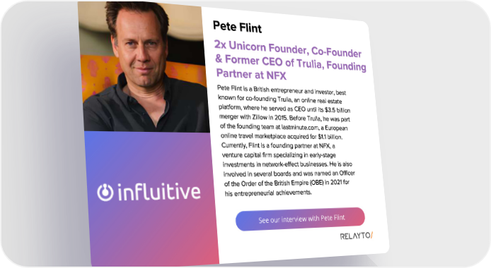 See our interview with Pete Flint Pete Flint Pete Flint is a British entrepreneur and investor , best known for co - founding Trulia , an online real estate platform , where he served as CEO until its $ 3 . 5 billion merger with Zillow in 2015 . Before Trulia , he was part of the founding team at lastminute . com , a European online travel marketplace acquired for $ 1 . 1 billion . Currently , Flint is a founding partner at NFX , a venture capital firm specializing in early - stage investments in network - effect businesses . He is also involved in several boards and was named an Officer of the Order of the British Empire ( OBE ) in 2021 for his entrepreneurial achievements . 2x Unicorn Founder , Co - Founder & Former CEO of Trulia , Founding Partner at NFX