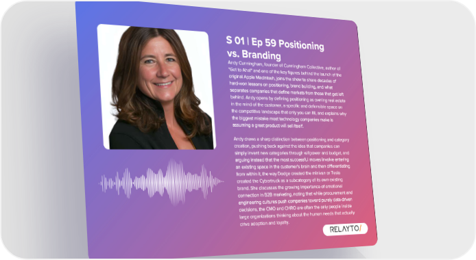 S 01 | Ep 59 Positioning vs . Branding Andy Cunningham , founder of Cunningham Collective , author of " Get to Aha !" and one of the key figures behind the launch of the original Apple Macintosh , joins the show to share decades of hard - won lessons on positioning , brand building , and what separates companies that define markets from those that get left behind . Andy opens by defining positioning as owning real estate in the mind of the customer , a specific and defensible space on the competitive landscape that only you can fill , and explains why the biggest mistake most technology companies make is assuming a great product will sell itself . Andy draws a sharp distinction between positioning and category creation , pushing back against the idea that companies can simply invent new categories through willpower and budget , and arguing instead that the most successful moves involve entering an existing space in the customer ' s brain and then differentiating from within it , the way Dodge created the minivan or Tesla created the Cybertruck as a subcategory of its own existing brand . She discusses the growing importance of emotional connection in B2B marketing , noting that while procurement and engineering cultures push companies toward purely data - driven decisions , the CMO and CHRO are often the only people inside large organizations thinking about the human needs that actually drive adoption and loyalty .