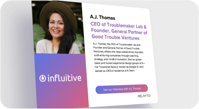 See our interview with A.J. Thomas A . J . Thomas A . J . Thomas , the CEO of Troublemaker Lab and Founder and General Partner of Good Trouble Ventures , where she helps extraordinary founders build enduring companies through coaching , strategy , and mindful innovation . She ran global talent and human experience design groups at X — the " moonshot factory " known as Google X — and served as CXO - in - residence at A . Team . CEO of Troublemaker Lab & Founder , General Partner of Good Trouble Ventures