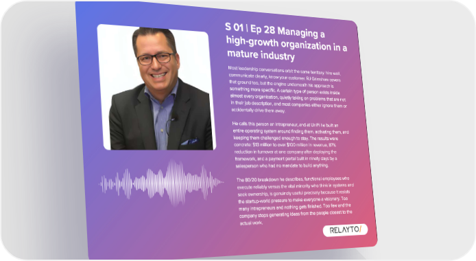 S 01 | Ep 28 Managing a high - growth organization in a mature industry Most leadership conversations orbit the same territory : hire well , communicate clearly , know your customer . RJ Grimshaw covers that ground too , but the engine underneath his approach is something more specific . A certain type of person exists inside almost every organization , quietly taking on problems that are not in their job description , and most companies either ignore them or accidentally drive them away . He calls this person an intrapreneur , and at UniFi he built an entire operating system around finding them , activating them , and keeping them challenged enough to stay . The results were concrete : $ 13 million to over $ 100 million in revenue , 87 % reduction in turnover at one company after deploying the framework , and a payment portal built in ninety days by a salesperson who had no mandate to build anything . The 80 / 20 breakdown he describes , functional employees who execute reliably versus the vital minority who think in systems and seek ownership , is genuinely useful precisely because it resists the startup - world pressure to make everyone a visionary . Too many intrapreneurs and nothing gets finished . Too few and the company stops generating ideas from the people closest to the actual work .