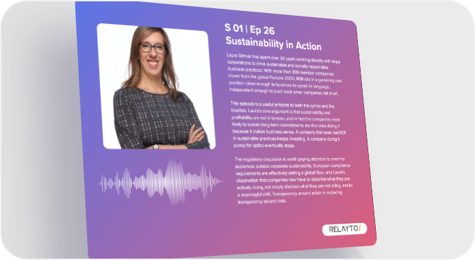 S 01 | Ep 26 Sustainability in Action Laura Gitman has spent over 30 years working directly with large corporations to drive sustainable and socially responsible business practices . With more than 300 member companies drawn from the global Fortune 2000 , BSR sits in a genuinely rare position : close enough to business to speak its language , independent enough to push back when companies fall short . This episode is a useful antidote to both the cynics and the idealists . Laura ' s core argument is that sustainability and profitability are not in tension , and in fact the companies most likely to sustain long - term commitments are the ones doing it because it makes business sense . A company that sees real ROI in sustainable practices keeps investing . A company doing it purely for optics eventually stops . The regulatory discussion is worth paying attention to even for audiences outside corporate sustainability . European compliance requirements are effectively setting a global floor , and Laura ' s observation that companies now have to describe what they are actively doing , not simply disclose what they are not doing , marks a meaningful shift . Transparency around action is replacing transparency around data .
