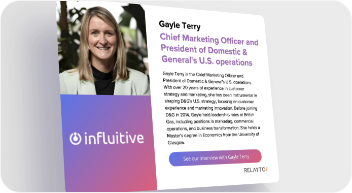 See our interview with Gayle Terry Gayle Terry Gayle Terry is the Chief Marketing Officer and President of Domestic & General ' s U . S . operations . With over 20 years of experience in customer strategy and marketing , she has been instrumental in shaping D & G ' s U . S . strategy , focusing on customer experience and marketing innovation . Before joining D & G in 2014 , Gayle held leadership roles at British Gas , including positions in marketing , commercial operations , and business transformation . She holds a Master ' s degree in Economics from the University of Glasgow . Chief Marketing Officer and President of Domestic & General ' s U . S . operations