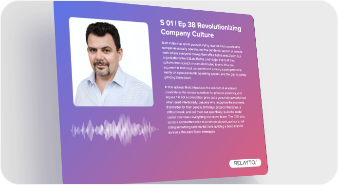 S 01 | Ep 38 Revolutionizing Company Culture Brett Putter has spent years studying how the best remote - first companies actually operate , not the pandemic version of remote work where everyone moved their office habits onto Zoom , but organizations like GitLab , Buffer , and Hotjar that built their cultures from scratch around distributed teams . His core argument is that most companies are running a post - pandemic reality on a pre - pandemic operating system , and the gap is quietly grinding them down . In this episode Brett introduces the concept of emotional proximity as the remote substitute for physical proximity , and argues it is not a consolation prize but a genuinely powerful tool when used intentionally . Leaders who recognize the moments that matter for their people , birthdays , project milestones , a difficult week , and call them out specifically , build the social capital that makes everything else move faster . The CEO who sends a handwritten note to a new employee ' s partner is not doing something sentimental ; he is building a bond that will survive a thousand Slack messages .