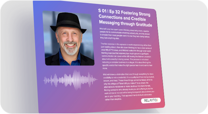 S 01 | Ep 32 Fostering Strong Connections and Credible Messaging through Gratitude Mitchell Levy has spent years thinking about why smart , capable people fail to communicate what they actually do , and his answer is simpler than most people want it to be : they lack clarity before they lack anything else . The live exercise in this episode is worth experiencing rather than just reading about . Alex sits down thinking he has a clear sense of what RELAYTO does , and Mitchell walks him through a ten - word framing exercise that exposes how much ground a confident communicator can cover while still leaving the listener uncertain about who exactly is being served . The process is not about reducing a complex business to a slogan . It is about finding the specific words that make the right person lean in and ask to hear more . Mitchell draws a distinction that runs through everything he does : credibility is not a credential , it is a quality built from being trusted , known , and liked . Those three things cannot be faked , which is why his critique of " fake it till you make it " is so direct . His alternative is not slower or more cautious . It is more honest , finding someone who already trusts you and offering to do the work at low or no cost while being transparent about where you are in your learning . That approach tends to build advocates rather than skeptics .