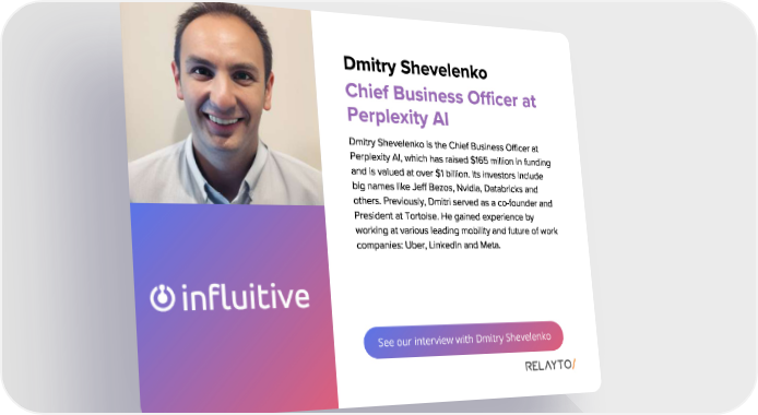 See our interview with Dmitry Shevelenko Dmitry Shevelenko Dmitry Shevelenko is the Chief Business Officer at Perplexity AI , which has raised $ 165 million in funding and is valued at over $ 1 billion . Its investors include big names like Jeff Bezos , Nvidia , Databricks and others . Previously , Dmitri served as a co - founder and President at Tortoise . He gained experience by working at various leading mobility and future of work companies : Uber , LinkedIn and Meta . Chief Business Officer at Perplexity AI