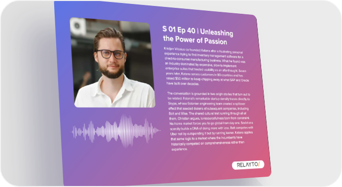 S 01 Ep 40 | Unleashing the Power of Passion Kristjan Vilosius co - founded Katana after a frustrating personal experience trying to find inventory management software for a direct - to - consumer manufacturing business . What he found was an industry dominated by expensive , slow - to - implement enterprise suites that treated usability as an afterthought . Seven years later , Katana serves customers in 80 countries and has raised $ 50 million to keep chipping away at what SAP and Oracle have built over decades . The conversation is grounded in two origin stories that turn out to be related . Estonia ' s remarkable startup density traces directly to Skype , whose Estonian engineering team created a spillover effect that seeded dozens of subsequent companies , including Bolt and Wise . The shared cultural trait running through all of them , Christian argues , is resourcefulness born from constraint . No home market forces you to go global from day one . Soviet - era scarcity builds a DNA of doing more with less . Bolt competes with Uber not by outspending it but by running leaner . Katana applies that same logic to a market where the incumbents have historically competed on comprehensiveness rather than experience .