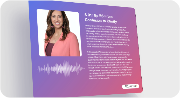 S 01 | Ep 56 From Confusion to Clarity Whitney Boyer , CMO of LHD Benefits , joins the show to share how a small marketing team is using technology to transform employee benefits communication for hundreds of clients across the country . Whitney opens by explaining the unique challenge her team faces : serving a value chain that runs from insurance carriers through employers , HR teams , and finance leaders all the way down to individual employees and their families , each of whom needs to understand complex benefit decisions in a way that is accessible and relevant to them . In this episode Whitney explains how embedding AI - powered chat into these experiences has become one of the company ' s biggest differentiators , allowing employees to ask specific questions and get answers sourced directly from plan documents , with citations , rather than waiting on hold with a carrier or putting the burden on an already - stretched HR team . She also walks through how the same approach transformed LHD ' s RFP process , turning 45 - page documents into interactive hubs that prospects can navigate and query , which the company credits for winning new business because finalists can experience the technology rather than just hear about it .