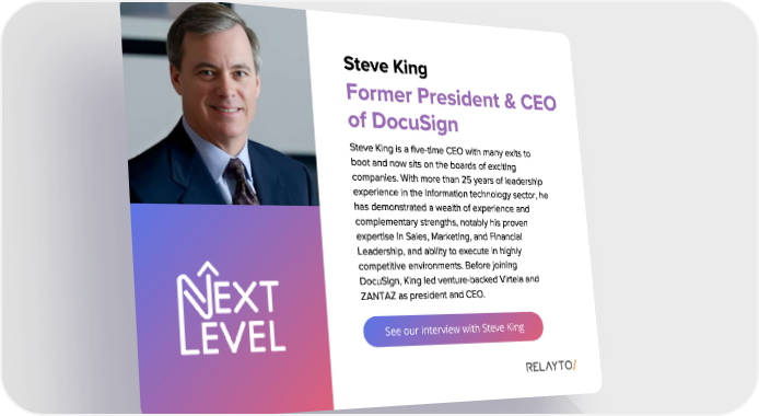See our interview with Steve King Steve King Steve King is a five - time CEO with many exits to boot and now sits on the boards of exciting companies . With more than 25 years of leadership experience in the information technology sector , he has demonstrated a wealth of experience and complementary strengths , notably his proven expertise in Sales , Marketing , and Financial Leadership , and ability to execute in highly competitive environments . Before joining DocuSign , King led venture - backed Virtela and ZANTAZ as president and CEO . Former President & CEO of DocuSign