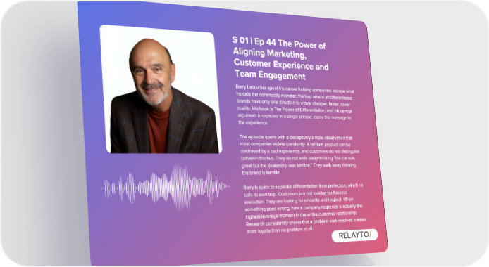 S 01 | Ep 44 The Power of Aligning Marketing , Customer Experience and Team Engagement Barry Labov has spent his career helping companies escape what he calls the commodity monster , the trap where undifferentiated brands have only one direction to move : cheaper , faster , lower quality . His book is The Power of Differentiation , and his central argument is captured in a single phrase : marry the message to the experience . The episode opens with a deceptively simple observation that most companies violate constantly . A brilliant product can be destroyed by a bad experience , and customers do not distinguish between the two . They do not walk away thinking " the car was great but the dealership was terrible ." They walk away thinking the brand is terrible . Barry is quick to separate differentiation from perfection , which he calls its own trap . Customers are not looking for flawless execution . They are looking for sincerity and respect . When something goes wrong , how a company responds is actually the highest - leverage moment in the entire customer relationship . Research consistently shows that a problem well - resolved creates more loyalty than no problem at all .