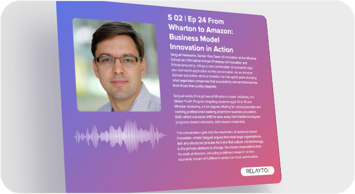 S 02 | Ep 24 From Wharton to Amazon : Business Model Innovation in Action Serguei Netessine , Senior Vice Dean of Innovation at the Wharton School and Dhirubhai Ambani Professor of Innovation and Entrepreneurship , brings a rare combination of academic rigor and real - world application to this conversation . As an Amazon Scholar and active venture investor , he has spent years studying what separates companies that successfully reinvent themselves from those that quietly stagnate . Serguei walks through two of Wharton ' s newer initiatives , the Global Youth Program targeting students ages 15 to 19 and Wharton Academy , a non - degree offering for undergraduates and working professionals seeking short - form business education . Both reflect a broader shift he sees away from traditional degree programs toward stackable , skills - based credentials . The conversation gets into the mechanics of business model innovation , where Serguei argues that most large organizations lack any structured process for it and that culture , not technology , is the primary obstacle to change . He shares observations from his work at Amazon , including published research on the economic impact of fulfillment centers on local communities .