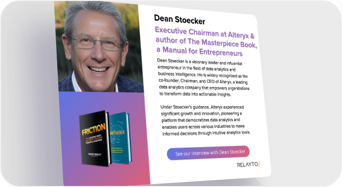 See our interview with Dean Stoecker Dean Stoecker Dean Stoecker is a visionary leader and influential entrepreneur in the field of data analytics and business intelligence . He is widely recognized as the co - founder , Chairman , and CEO of Alteryx , a leading data analytics company that empowers organizations to transform data into actionable insights . Under Stoecker ' s guidance , Alteryx experienced significant growth and innovation , pioneering a platform that democratizes data analytics and enables users across various industries to make informed decisions through intuitive analytics tools . Executive Chairman at Alteryx & author of The Masterpiece Book , a Manual for Entrepreneurs