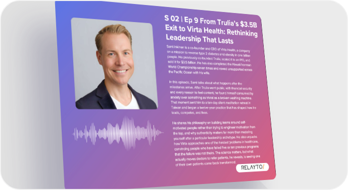 S 02 | Ep 9 From Trulia ’ s $ 3 . 5B Exit to Virta Health : Rethinking Leadership That Lasts Sami Inkinen is a co - founder and CEO of Virta Health , a company on a mission to reverse type 2 diabetes and obesity in one billion people . He previously co - founded Trulia , scaled it to an IPO , and sold it for $ 3 . 5 billion . He has also completed the Hawaii Ironman World Championship seven times and rowed unsupported across the Pacific Ocean with his wife . In this episode , Sami talks about what happens after the milestones arrive . After Trulia went public , with financial security and every reason to feel content , he found himself consumed by anxiety over something as trivial as a broken washing machine . That moment sent him to a ten - day silent meditation retreat in Taiwan and began a twelve - year practice that has shaped how he leads , competes , and lives . He shares his philosophy on building teams around self - motivated people rather than trying to engineer motivation from the top , and why authenticity matters far more than modeling yourself after a particular leadership archetype . He also unpacks how Virta approaches one of the hardest problems in healthcare , convincing people who have failed five or ten previous programs that the failure was not theirs . The science matters , but what actually moves doctors to refer patients , he reveals , is seeing one of their own patients come back transformed .