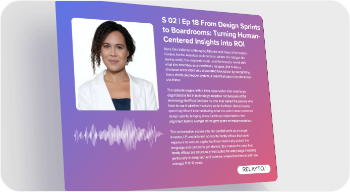 S 02 | Ep 18 From Design Sprints to Boardrooms : Turning Human - Centered Insights into ROI Iliana Oris Valiente is Managing Director and Head of Innovation Centers for the Americas at Accenture , where she bridges the startup world , the corporate world , and the investor world with what she describes as a translator ' s mindset . She is also a chartered accountant who discovered blockchain by recognizing it as a distributed ledger system , a detail that says a lot about how she thinks . The episode begins with a frank observation that most large organizations fail at technology adoption not because of the technology itself but because no one ever asked the people who have to use it whether it actually works for them . Iliana ’ s teams spend significant time facilitating what she calls human - centered design sprints , bringing cross - functional stakeholders into alignment before a single dollar gets spent on implementation . The conversation moves into her parallel work as an angel investor , LP , and informal advisor to family offices that want exposure to venture capital but have historically lacked the language and context to get started . She makes the case that family offices are structurally well suited for early - stage investing , particularly in deep tech and science , where timelines to exit now average 11 to 12 years .