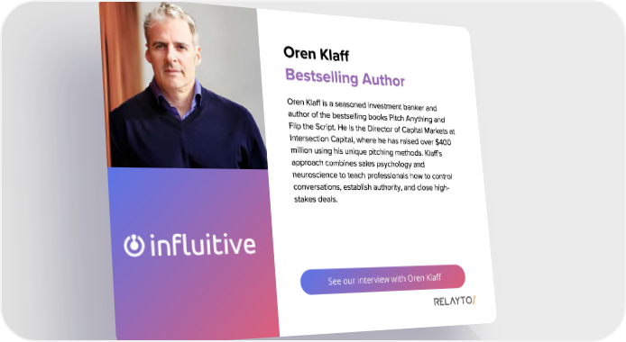 See our interview with Oren Klaff Oren Klaff Oren Klaff is a seasoned investment banker and author of the bestselling books Pitch Anything and Flip the Script . He is the Director of Capital Markets at Intersection Capital , where he has raised over $ 400 million using his unique pitching methods . Klaff ' s approach combines sales psychology and neuroscience to teach professionals how to control conversations , establish authority , and close high - stakes deals . Bestselling Author