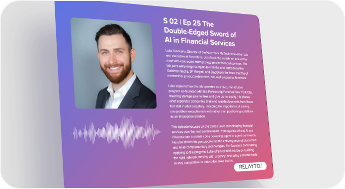 S 02 | Ep 25 The Double - Edged Sword of AI in Financial Services Luke Giancarlo , Director of the New York FinTech Innovation Lab and executive at Accenture , pulls back the curtain on one of the most well - connected startup programs in financial services . The lab pairs early - stage companies with tier one institutions like Goldman Sachs , JP Morgan , and BlackRock for three months of mentorship , product refinement , and real enterprise feedback . Luke explains how the lab operates as a civic , non - dilutive program co - founded with the Partnership Fund for New York City , meaning startups pay no fees and give up no equity . He shares what separates companies that land real deployments from those that stall in pilot purgatory , including the importance of solving one problem exceptionally well rather than positioning a platform as an all - purpose solution . This episode focuses on the trends Luke sees shaping financial services over the next several years , from agentic AI and AI ops infrastructure to stable coins powering agent - to - agent commerce . He also shares his perspective on the convergence of blockchain and AI as complementary technologies . For founders considering applying to the program , Luke offers candid advice on building the right network , moving with urgency , and using available tools to stay competitive in enterprise sales cycles .