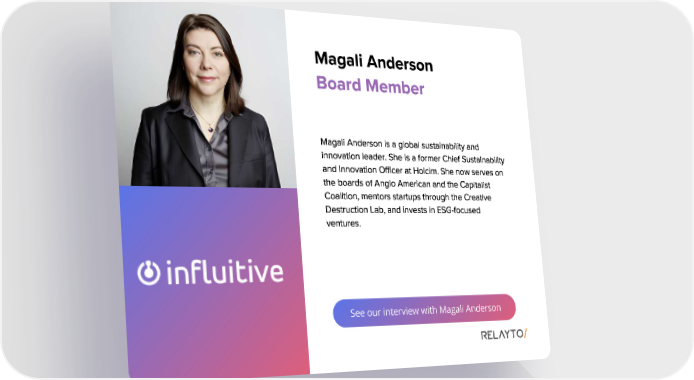 See our interview with Magali Anderson Magali Anderson Magali Anderson is a global sustainability and innovation leader . She is a former Chief Sustainability and Innovation Officer at Holcim . She now serves on the boards of Anglo American and the Capitalist Coalition , mentors startups through the Creative Destruction Lab , and invests in ESG - focused ventures . Board Member