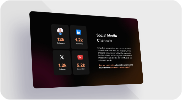 Social Media Channels 12k 1.2k Followers Followers Episode is promoted on our main social media channels with more than 20K followers. From engaging snippets and behind-the-scenes to live interactions, we leverage the vast expanse of social media to elevate the narratives of our esteemed guests. Join our community, witness the journey, and 1.2k 5.2k be part of the conversations that matter! Followers Subscribers