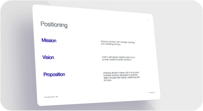 Brand Style Guideline - 2021 www.poixel.com 3 Positioning Advance pioneers with strategic branding and marketing services. Mission Vision Proposition Craft a well-design insightful data hub to provide credible business solutions. Assisting decision makers with a structured business solutions developed by authintic data to forcast their brands’ positioning and its future.
