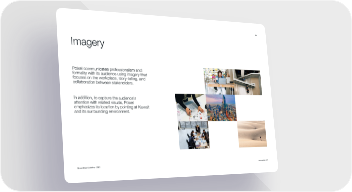 Brand Style Guideline - 2021 www.poixel.com 25 Imagery Poixel communicates professionalism and formality with its audience using imagery that focuses on the workplace, story-telling, and collaboration between stakeholders. In addition, to capture the audience's attention with related visuals, Poixel emphasizes its location by pointing at Kuwait and its surrounding environment.