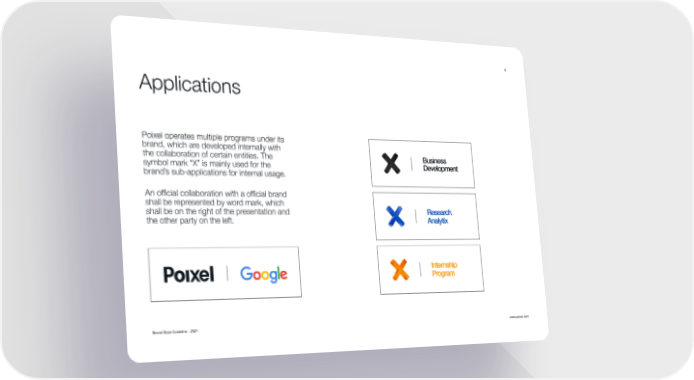 Business Development Brand Style Guideline - 2021 www.poixel.com 8 Applications Poixel operates multiple programs under its brand, which are developed internally with the collaboration of certain entities. The symbol mark “X” is mainly used for the brand’s sub-applications for internal usage. An official collaboration with a official brand shall be represented by word mark, which shall be on the right of the presentation and the other party on the left. Internship Program Research Analytix