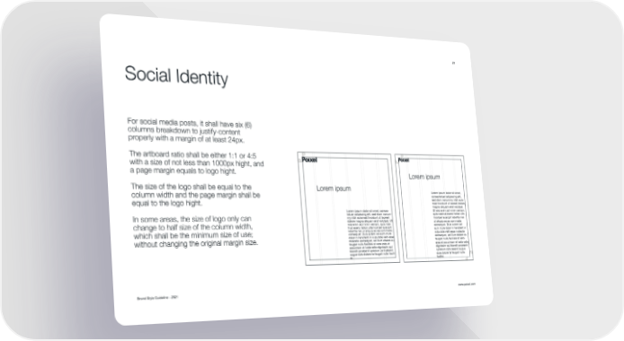Brand Style Guideline - 2021 www.poixel.com 23 Social Identity For social media posts, it shall have six (6) columns breakdown to justify-content properly with a margin of at least 24px. The artboard ratio shall be either 1:1 or 4:5 with a size of not less than 1000px hight, and a page margin equals to logo hight. The size of the logo shall be equal to the column width and the page margin shall be equal to the logo hight. In some areas, the size of logo only can change to half size of the column width, which shall be the minimum size of use; without changing the original margin size. Lorem ipsum dolor sit amet, consec- tetuer adipiscing elit, sed diam nonum- my nibh euismod tincidunt ut laoreet dolore magna aliquam erat volutpat. Ut wisi enim ad minim veniam, quis nos- trud exerci tation ullamcorper suscipit lobortis nisl ut aliquip ex ea commodo consequat. Duis autem vel eum iriure dolor in hendrerit in vulputate velit esse molestie consequat, vel illum dolore eu feugiat nulla facilisis at vero eros et accumsan et iusto odio dignissim qui blandit praesent luptatum zzril delenit augue duis dolore te feugait nulla facili- si. Lorem ipsum dolor sit amet, consectetuer adipiscing elit, sed diam nonummy nibh euis- mod tincidunt ut laoreet dolore magna aliquam erat volutpat. Ut wisi enim ad minim veniam, quis nostrud exerci tation ulla- mcorper suscipit lobortis nisl ut aliquip ex ea commodo consequat. Duis autem vel eum iriure dolor in hendrerit in vulputate velit esse molestie consequat, vel illum dolore eu feugiat nulla facilisis at vero eros et accumsan et iusto odio dignissim qui blandit praesent luptatum zzril delenit augue duis dolore te feugait nulla facilisi. Lorem ipsum Lorem ipsum