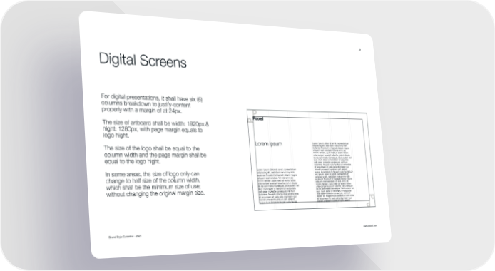 Brand Style Guideline - 2021 www.poixel.com 22 Digital Screens Lorem ipsum dolor sit amet, consectetuer adipiscing elit, sed diam nonummy nibh euismod tincidunt ut laoreet dolore magna aliquam erat volutpat. Ut wisi enim ad minim veniam, quis nostrud exerci tation ullamcorper suscipit lobortis nisl ut aliquip ex ea commodo consequat. Duis autem vel eum iriure dolor in hendrerit in vulputate velit esse molestie consequat, vel illum dolore eu feugiat nulla facilisis at vero eros et accumsan et iusto odio dignissim qui blandit praesent luptatum zzril delenit augue duis dolore te feugait nulla facilisi. Lorem ipsum dolor sit amet, consectetuer adipiscing elit, sed diam nonummy nibh euismod tincidunt ut laoreet dolore magna aliquam erat volutpat. Ut wisi enim ad minim veniam, quis nostrud exerci tation ullamcorper suscipit lobortis nisl ut aliquip ex ea commodo consequat. Duis autem vel eum iriure dolor in hendrerit in vulputate velit esse molestie consequat, vel illum dolore eu feugiat nulla facilisis at vero eros et accumsan et iusto odio dignissim qui blandit praesent luptatum zzril delenit augue duis dolore te feugait nulla facilisi.Lor- em ipsum dolor sit amet, consectetuer adipiscing elit, sed diam nonummy nibh euismod tincidunt ut laoreet dolore magna aliquam erat volutpat. Ut wisi enim ad minim veniam, quis nostrud exerci tation ullamcorper suscipit lobortis nisl ut aliquip ex ea commodo consequat. Duis autem vel eum iriure dolor in hendrerit in vulputate velit esse molestie consequat, vel illum dolore eu feugiat nulla facilisis at vero eros et accumsan et iusto odio dignissim qui blandit praesent luptatum zzril delenit Lorem ipsum For digital presentations, it shall have six (6) columns breakdown to justify-content properly with a margin of at 24px. The size of artboard shall be width: 1920px & hight: 1280px, with page margin equals to logo hight. The size of the logo shall be equal to the column width and the page margin shall be equal to the logo hight. In some areas, the size of logo only can change to half size of the column width, which shall be the minimum size of use; without changing the original margin size.