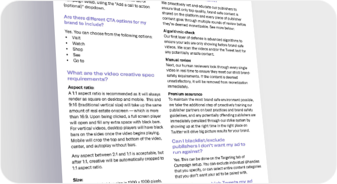 Troubleshooting + FAQs Can I include a CTA URL How can I be sure my ad is paired for my pre-roll video? with brand safe content? Yes. This can be done via the Creatives tab of We proactively vet and educate our publishers to Campaign setup, using the “Add a call to action ensure that only top quality, brand safe content is (optional)“ dropdown. shared on the platform and every piece of publisher content goes through multiple rounds of review before Are there different CTA options for my they’re deemed monetizable. See more below: brand to include? Algorithmic check Yes. You can choose from the following options: Our first layer of defense is advanced algorithms to • Visit ensure your ads are only showing before brand safe • Watch videos. We scan the videos and/or the Tweet text for • Shop any potentially unsafe content. • See Manual review • Go to Next, our human reviewers look through every single video in real time to ensure they meet our strict brand- What are the video creative spec safety requirements. If the content is deemed requirements? unsatisfactory, it will be removed from monetization Aspect ratio: immediately. A 1:1 aspect ratio is recommended as it will always Premium assurance render as square on desktop and mobile. This and To maintain the most brand safe environment possible, 9:16 (traditional vertical size) will take up the same we take the additional step of proactively training our amount of real estate onscreen — which is more publisher partners on best practices and brand safety than 16:9. Upon being clicked, a full screen player guidelines, and any potentially offending publishers are will open and fill any extra space with black bars. immediately penalized through our strike system by For vertical videos, desktop players will have black showing up at the right time in the right place on bars on the sides once the video begins playing. Twitter will drive big picture results for your brand. Mobile will crop the top and bottom of the video, Can I blacklist/exclude center, and autoplay without bars. publishers I don’t want my ad to Any aspect between 2:1 and 1:1 is acceptable, but run against? after 1:1, creative will be automatically cropped to Yes. This can be done on the Targeting tab of 1:1 aspect ratio. Campaign setup. You can exclude individual @handles Size: that you specify, or can select entire content categories Recommended video size is 1200 x 1200 pixels. that you don’t want your ad to be paired with. Minimum accepted sizes are 600 X600 for 1:1 Can I choose which Tweets my ad videos and 640 x 360 for all other aspect ratios. runs on? Note: If the height exceeds the width, the video will Before your campaign goes live, you can review your be cropped to 1:1 in the feed and will expand upon targeting, content category selections/exclusions, and being clicked. any @handles that you specified to exclude. Publisher + Max file size is 1GB. Tweet level pairing will be determined dynamically in real time based on content and active audience availability, and the ads auction. This cannot be predetermined. 27