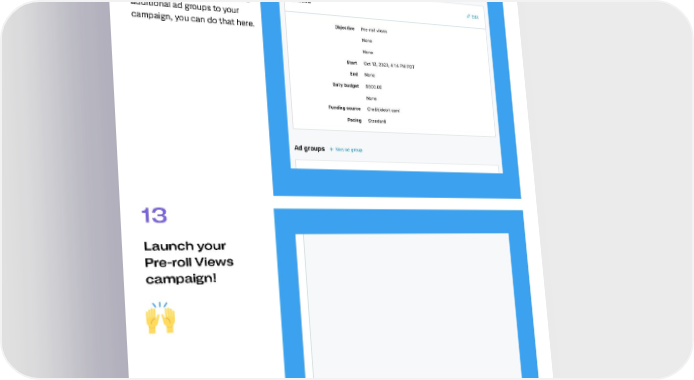 How to get started 12 Review your final campaign setup on the "Campaign Review" tab. If you'd like to add additional ad groups to your campaign, you can do that here. 13 Launch your Pre-roll Views campaign! 25