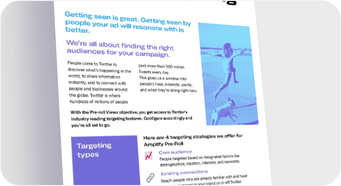 Campaign targeting Getting seen is great. Getting seen by people your ad will resonate with is better. We’re all about finding the right audiences for your campaign. People come to Twitter to post more than 500 million discover what’s happening in the Tweets every day. world, to share information This gives us a window into instantly, and to connect with people’s lives, interests, wants, people and businesses around and what they’re doing right now. the globe. Twitter is where hundreds of millions of people With the Pre-roll Views objective, you get access to Twitter’s industry-leading targeting features. Configure accordingly and you’re all set to go. Here are 4 targeting strategies we offer for Targeting Amplify Pre-Roll types Core audience People targeted based on designated factors like demographics, location, interests, and keywords. Existing connections Reach people who are already familiar with and have expressed interest in your brand on or off Twitter. Look-alikes Discover brand new people with habits, interests, and backgrounds similar to your existing followers or customers. Publisher content categories Pair your content exclusively with publisher content from the categories that are best aligned with your brand or message. 13
