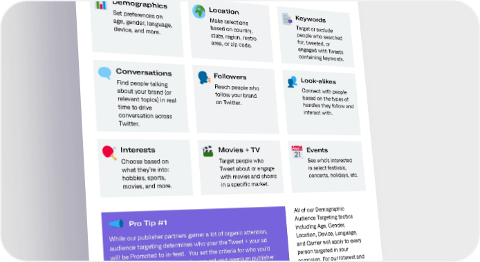 Campaign Targeting Core audience targeting Ready to hone in on your perfect target group? Start here. Twitter’s Pre-roll audience targeting allows you to set parameters to find your ideal audience. Demographics Location Keywords Set preferences on Make selections Target or exclude age, gender, language, based on country, people who searched device, and more. state, region, metro for, tweeted, or area, or zip code. engaged with Tweets containing keywords. Conversations Followers Look-alikes Find people talking Reach people who Connect with people about your brand (or follow your brand based on the types of relevant topics) in real on Twitter. handles they follow and time to drive interact with. conversation across Twitter. Interests Movies + TV Events Choose based on Target people who See who’s interested what they’re into: Tweet about or engage in select festivals, hobbies, sports, with movies and shows concerts, holidays, etc. movies, and more. in a specific market. All of our Demographic Pro Tip #1 Audience Targeting tactics While our publisher partners garner a lot of organic attention, including Age, Gender, audience targeting determines who your the Tweet + your ad Location, Device, Language, will be Promoted to in-feed. You set the criteria for who you’d and Carrier will apply to every like to reach, we serve them the pre-roll and premium publisher person targeted in your content. campaign. For our Interest and Action based targeting tactics, including Keywords, Interests, Follower Look-alikes, and Conversations, a person can only be targeted by your campaign based on a single parameter, not multiple. 14