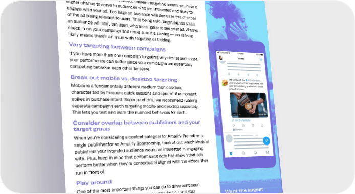 Campaign Targeting Other targeting tips to optimize your campaign Target with focus Creating campaigns with focused, relevant targeting means you have a higher chance to serve to audiences who are interested and likely to engage with your ad. Too large an audience will decrease the chances of the ad being relevant to users. That being said, targeting too small an audience will limit the users who are eligible to see your ad. Always check in on your campaign and make sure it’s serving — no serving likely means there’s an issue with targeting or bidding. Vary targeting between campaigns If you have more than one campaign targeting very similar audiences, your performance can suffer since your campaigns are essentially competing between each other for serve. Break out mobile vs. desktop targeting Mobile is a fundamentally different medium than desktop, characterized by frequent quick sessions and spur-of-the-moment spikes in purchase intent. Because of this, we recommend running separate campaigns each targeting mobile and desktop separately. This lets you test and learn the nuanced behaviors for each. Consider overlap between publishers and your target group When you’re considering a content category for Amplify Pre-roll or a single publisher for an Amplify Sponsorship, think about which kinds of publishers your intended audience would be interested in engaging with. Plus, keep in mind that performance data has shown that ads perform better when they’re contextually aligned with the videos they run in front of. Play around One of the most important things you can do to drive continued campaign performance is to test what works for you and your Want the largest campaigns. While it makes sense to run always-on campaigns, you’ll possible reach? want to continually refresh and optimize your campaigns, given Plan to run your pre-roll across a Twitter’s ever-changing, real-time nature. Try new categories or wide range of content categories publishers, remove low performing keywords, interests, etc. and try a and stick to just a few key fresh take. Pay attention to what works best for you! audience targeting criteria. 17