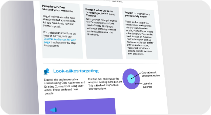 Campaign Targeting Existing connections targeting Yes, Core Audience Targeting is a big help in finding a large and relevant audience. But maybe you’re looking for a more specific group of people? Here’s where you find people who have already shown interest in your brand. People who’ve People who’ve seen People or customers visited your website or engaged with past you already know Tweets Target individuals who have Now you can retarget anyone These are the people you already visited your website. who’s watched your video, already know are interested. All you have to do is install liked a Tweet, or engaged Identify them based on Twitter’s pixel. with your organic/promoted emails, Twitter IDs, or mobile content within a certain advertising IDs. You can also For detailed instructions on timeframe. work through an Audience how to do this, visit our Partner to import existing Custom Audiences for Web customer audiences directly page that has step-by-step into your Ads account. instructions. Reconnect with them or exclude them to focus on new acquisition. Look-alikes targeting Core audience & existing connections Expand the audience you’ve that like, act, and engage the created using Core Audiences and way your existing customers do. Existing Connections using Look- This is the best way to scale Look-alike alikes. These are brand new your campaigns. audiences people Pro Tip #3 Have more questions about targeting? Visit our detailed Q&As on: Device targeting | Geo, gender, and language targeting | Interest and follower targeting | Keyword targeting | Custom Audiences 16