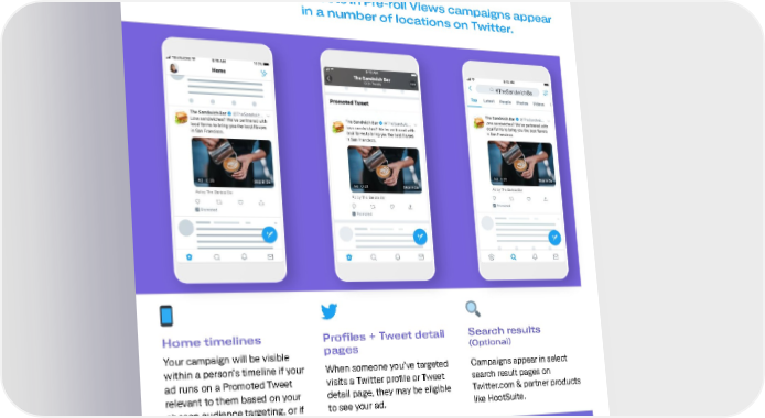 Where your ads appear Tweets in Pre-roll Views campaigns appear in a number of locations on Twitter. #TheSandwichBa Home timelines Profiles + Tweet detail Search results Your campaign will be visible pages (Optional) within a person’s timeline if your When someone you’ve targeted Campaigns appear in select ad runs on a Promoted Tweet visits a Twitter profile or Tweet search result pages on relevant to them based on your detail page, they may be eligible Twitter.com & partner products chosen audience targeting, or if to see your ad. like HootSuite. they organically follow the publisher whose content your ad was paired with. If someone on Twitter views a Tweet that your pre-roll has been paired with, they may be Pro Tip shown your video if they fit the targeting criteria you specified. If someone views the publisher Tweet but does not fit your targeting criteria, they will not be shown your pre-roll. 05