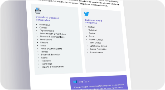Campaign Targeting Publisher content categories Find your most engaged audience by pairing your content exclusively with publisher content from the category or categories that are best aligned with your brand or message. Or take it to the next level by trying one of our new Curated Categories, which are created manually by our team for close alignment with the top voices on a given topic. Full publisher lists for Curated Categories are shared prior to launch. Standard content Twitter curated categories categories • Automotive • Football • Comedy • Basketball • Digital Creators • Baseball • Entertainment & Pop Culture • Soccer • Financial & Business News • Women’s Lifestyle • Food & Drink • Lifestyle • Men’s Lifestyle • Music • Light-hearted Content • News & Current Events • Gaming Personalities • Politics • & more to come • Science & Education • Sports • Television • Technology • eSports & Video Games Pro Tip #1 When running on standard content categories, you can exclude up to 100 individual publishers who you know may not be the right fit for your brand to make sure they’re not included in your targeting. With Curated Categories, you can’t layer on any exclusions but you can see the full list of Twitter-selected and approved publishers in your Ads Manager (not available for standard categories). 15