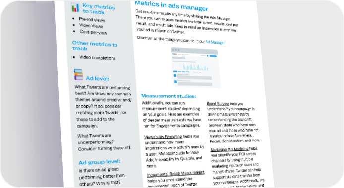 Measuring results Metrics in ads manager Key metrics Get real-time results any time by visiting the Ads Manager. to track There you can explore metrics like total spend, results, cost per • Pre-roll views result, and result rate. Keep in mind an impression is any time • Video Views your ad is shown on Twitter. • Cost-per-view Discover all the things you can do in our Ad Manager. Other metrics to track • Video completions Ad level: What Tweets are performing best? Are there any common Measurement studies: themes around creative and/ Additionally, you can run Brand Surveys help you or copy? If so, consider measurement studies* depending understand if your campaign is creating more Tweets like on your goals. Here are examples driving mass awareness by these to add to the of deeper measurements we have understanding the brand lift campaign. run for Engagements campaigns. between those who have seen What Tweets are your ad and those who have not. underperforming? Viewability Reporting helps you Metrics include Awareness, understand how many Recall, Consideration, and more. Consider turning these off. impressions were actually seen by a user. Metrics include In-View Marketing Mix Modeling helps Ad group level: Ads, Viewability by Quartile, and you quantify your ROI across Is there an ad group more. channels by using multiple marketing inputs on sales and performing better than Incremental Reach Measurement market shares. Twitter can help others? Why is that? helps you understand the support the data transfer from Audience level: incremental reach of Twitter your campaigns. Additionally, we beyond TV and illustrate the can interpret, contextualize, and What audiences are your added frequency or media impact analyze client results to identify Tweets resonating with of Twitter and TV. Metrics include recommendations to improve most? Incremental Reach on Twitter, performance. Cost per Reach Point, and more. *Study feasibility and availability of solutions and partners vary by market. Please chat with your Twitter Client Partner for more details. You can find all of Twitter’s measurement solutions here. 26