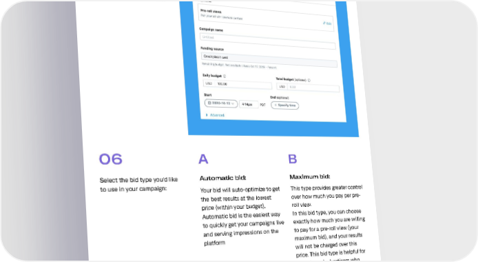 How to get started 05 Next, you'll set up your first ad group. You can also set ad group start and end time. 06 A B Select the bid type you'd like Automatic bid: Maximum bid: to use in your campaign: Your bid will auto-optimize to get This type provides greater control the best results at the lowest over how much you pay per pre- price (within your budget). roll view. Automatic bid is the easiest way In this bid type, you can choose to quickly get your campaigns live exactly how much you are willing and serving impressions on the to pay for a pre-roll view (your platform maximum bid), and your results will not be charged over this price. This bid type is helpful for experienced advertisers who know exactly how much they’re looking to pay per pre-roll view at scale. 21