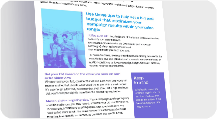 Bid types Next let’s talk billing bid types There is no minimum budget for Twitter Ads, but setting competitive bids and budgets for your campaigns allows them to win auctions and serve. Use these tips to help set a bid and budget that maximizes your campaign results within your price range: Utilize auto bid. Your bid is one of the factors that determines how frequently your ad is displayed. We provide a recommended bid (informed by past successful campaigns) which indicates the amount that will best help you reach your goal. For new advertisers, we recommend automatic bidding because it’s the most flexible and cost effective, and updates in real-time are based on auction conditions to fit your campaign budget. Once your bid is set, you will never be charged more. Set your bid based on the value you place on each extra video view Keep When entering your bid, consider the value of each view your video will in mind receive and let that dictate what you’d like to pay. With a small budget, it’s easy to set a low bid, but remember, even if you set a high maximum A higher bid means you bid, you’ll only pay slightly more than the second highest bidder. are more likely to win the Match bid to targeting size. If your campaigns are targeting very auction, which will then specific audiences, you may have to increase your bid in order to serve. lead to more views. A bid For example, advertisers targeting specific geographic regions may below competitors’ bids need to bid more to win the same number of auctions as advertisers may not serve. targeting less specific audiences, as there are less people in that audience. In addition to controlling the amount you pay per view, you can also control the daily budget you’re willing to spend on each campaign. Once your daily budget has been reached, the campaign will temporarily stop serving until the following day (or until the daily budget is increased). You can also set a total budget for the campaign.Find more information on bids and budgeting in our bidding and auctions FAQ. 12