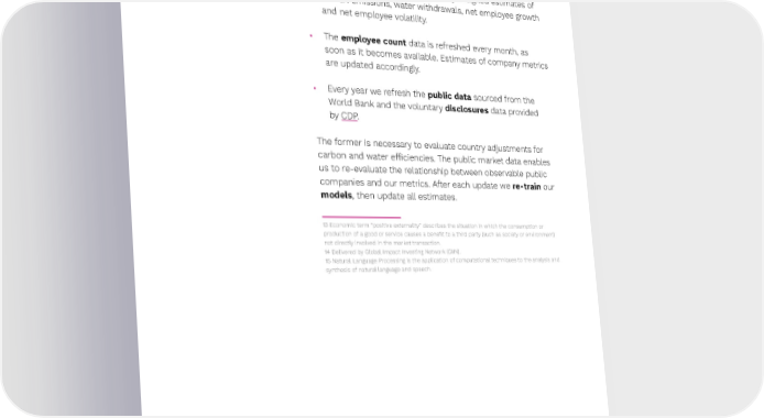 Preqin ESG Solutions 50 Data update Private Company ESG Risk Metrics relies on third-party, public, and public markets disclosure data. Our process for updating process these is an action tree: • Every time a new private company is featured on Preqin Pro, with a known employee count and a speci昀椀ed headquarters location, it is instantly assigned estimates of carbon emissions, water withdrawals, net employee growth and net employee volatility. • The employee count data is refreshed every month, as soon as it becomes available. Estimates of company metrics are updated accordingly. • Every year we refresh the public data sourced from the World Bank and the voluntary disclosures data provided by CDP. The former is necessary to evaluate country adjustments for carbon and water e昀케ciencies. The public market data enables us to re-evaluate the relationship between observable public companies and our metrics. After each update we re-train our models, then update all estimates. 13 Economic term “positive externality” describes the situation in which the consumption or production of a good or service causes a bene昀椀t to a third party (such as society or environment) not directly involved in the market transaction. 14 Delivered by Global Impact Investing Network (GIIN). 15 Natural Language Processing is the application of computational techniques to the analysis and synthesis of natural language and speech. ↗ Back to Contents
