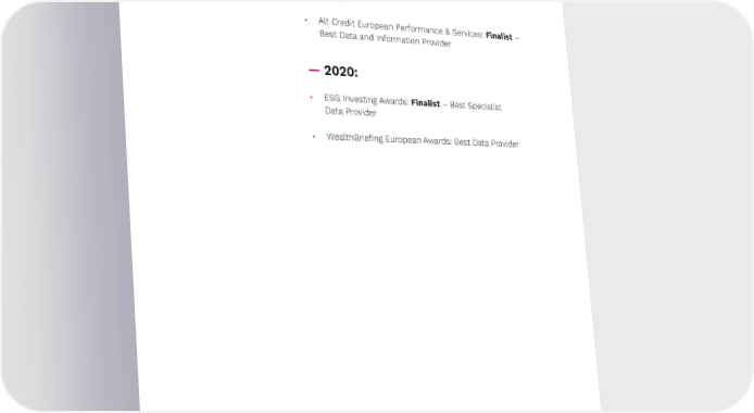 Preqin ESG Solutions 10 • Megabuyte100 Awards: Shortlisted – Banking and Insurance (Software and Digital Platforms) • ESG Investing Awards: Runner Up – Best Specialist ESG Data Provider — 2021: • Alt Credit European Performance & Services: Finalist – Best Data and Information Provider — 2020: • ESG Investing Awards: Finalist – Best Specialist Data Provider • WealthBrie昀椀ng European Awards: Best Data Provider ↗ Back to Contents