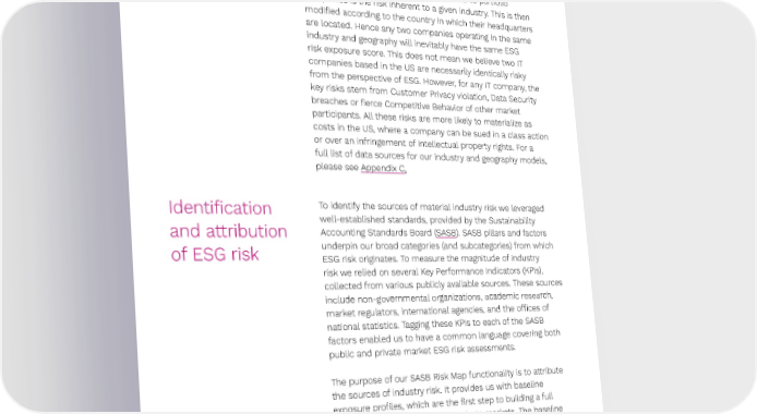Preqin ESG Solutions 30 Hence, at this point, it is only applicable to private equity, private debt, and venture capital. ESG Risk Exposure scores were designed to be compared across portfolio companies, portfolios, and fund manager 昀椀rms. As a result, a level of a score cannot be used to measure absolute risk. The fundamental risk exposure we attribute to portfolio companies is the risk inherent to a given industry. This is then modi昀椀ed according to the country in which their headquarters are located. Hence any two companies operating in the same industry and geography will inevitably have the same ESG risk exposure score. This does not mean we believe two IT companies based in the US are necessarily identically risky from the perspective of ESG. However, for any IT company, the key risks stem from Customer Privacy violation, Data Security breaches or 昀椀erce Competitive Behavior of other market participants. All these risks are more likely to materialize as costs in the US, where a company can be sued in a class action or over an infringement of intellectual property rights. For a full list of data sources for our industry and geography models, please see Appendix C. Identi昀椀cation To identify the sources of material industry risk we leveraged well-established standards, provided by the Sustainability and attribution Accounting Standards Board (SASB). SASB pillars and factors of ESG risk underpin our broad categories (and subcategories) from which ESG risk originates. To measure the magnitude of industry risk we relied on several Key Performance Indicators (KPIs), collected from various publicly available sources. These sources include non-governmental organizations, academic research, market regulators, international agencies, and the o昀케ces of national statistics. Tagging these KPIs to each of the SASB factors enabled us to have a common language covering both public and private market ESG risk assessments. The purpose of our SASB Risk Map functionality is to attribute the sources of industry risk. It provides us with baseline exposure pro昀椀les, which are the 昀椀rst step to building a full picture of ESG risk exposure in private markets. The baseline of risk exposure of any asset is determined by the industry in which it operates. The risk exposure of a fund is determined by the industries in which the underlying assets of that fund operate. Similarly, the risk exposure of a fund manager is based on the exposure of the funds in their portfolio. ↗ Back to Contents